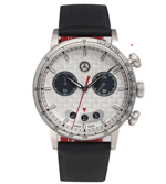 triangle indicates the current date. The stopwatch function can be used to measure lap times. To ensure that the time can be read reliably even in the dark, the indices and hands feature SuperLumiNova® luminous material. The dial of the watch is protected by an anti-reflective and slightly curved sapphire crystal. The leather strap, which is embossed with the tyre pattern used at the time on the upper side, ensures that the watch is comfortable to wear. The chronograph watch is water-resistant to 5 ATM.