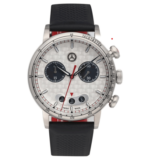 The sporty men's chronograph watch with Swiss movement Z50 from Ronda is modelled on the historic Silver Arrow race cars. The streamlined race cars are reflected in the soft shape of the watch case, while styling elements on the sides of the lugs and on the top of the calendar window are reminiscent of the milled holes and lightweight construction of days gone by. The bezel has a fine, black tachymeter scale to measure speed. The surface of the dial is embossed with a perlage pattern, which is modelled on the surface of the Silver Arrow dashboards. A red