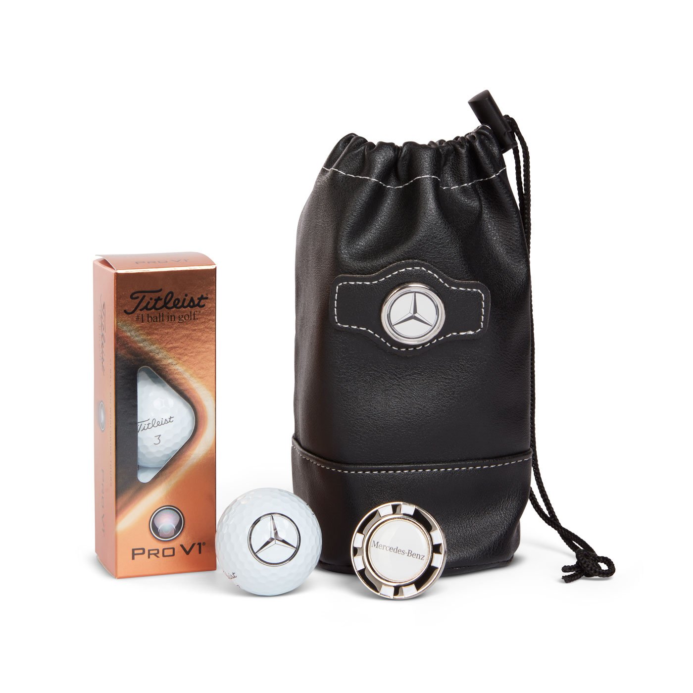 For the performance golfer, this golf kit includes three Titleist® Pro V1® golf balls, and a Marker Mate ball marker. The Marker Mate design utilizes precise magnetic technology to fully suspend the ball marker inside the poker chip. Simply press the ball marker out of the center and mark your spot. packaged in synthetic leather valuables cinch pouch.